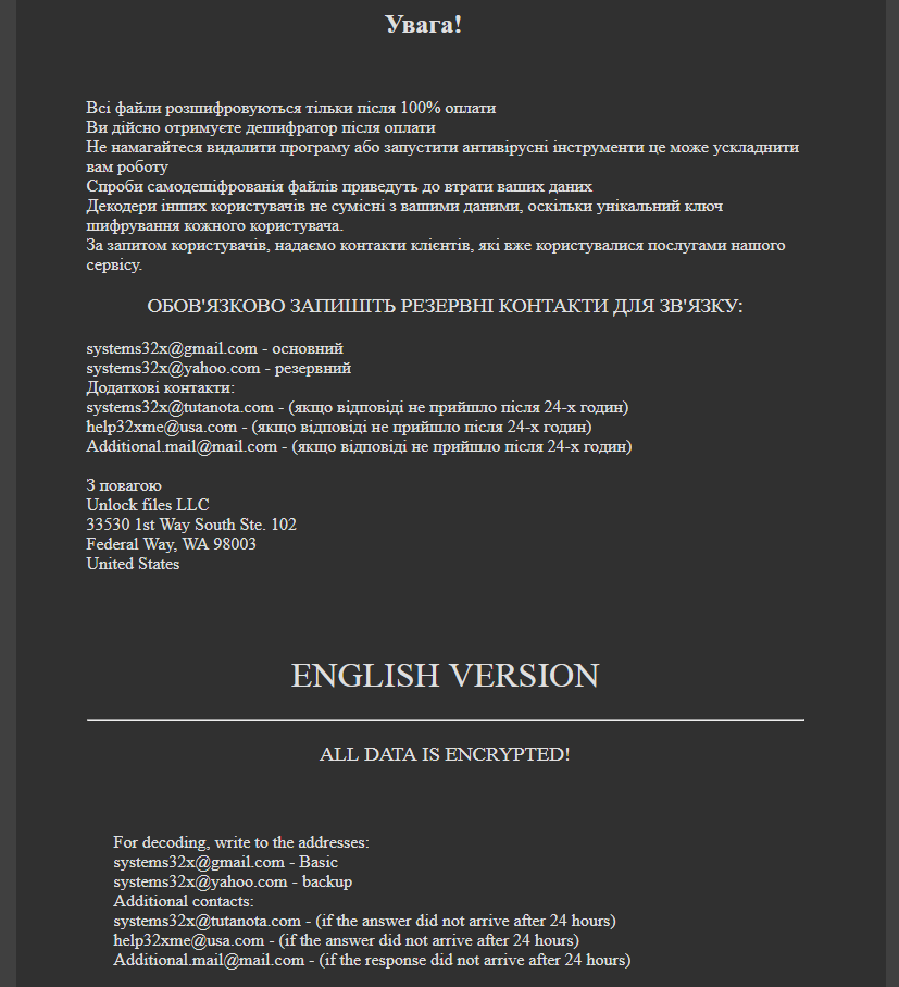 systems32x@tutanota.com – (якщо відповіді не прийшло після 24-х годин)