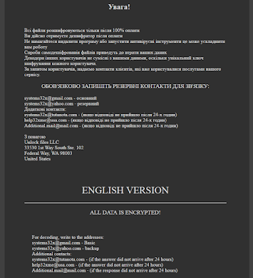 Програма можемо дешифрувати один файл як доказ того, що у неї є декодер. Для цього необхідно надіслати зашифрований файл – вагою не більше 2 mb, и ваш уникальный идентификационный код, на пошту: systems32x@gmail.com