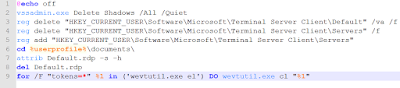 As usual, a temporary batch file will be used to clear Volume Shadow Copies as well as Event Logs: