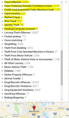 As an example, Zooming the number in Tennessee, I can now see a red pin for Nashville. When I hover that pin, it shows me how many crimes in each NIBRS category were reported for 2017, including 107 cases of Wire Fraud, 34 cases of Identity Theft, and only 3 cases of Hacking/Computer Invasion: