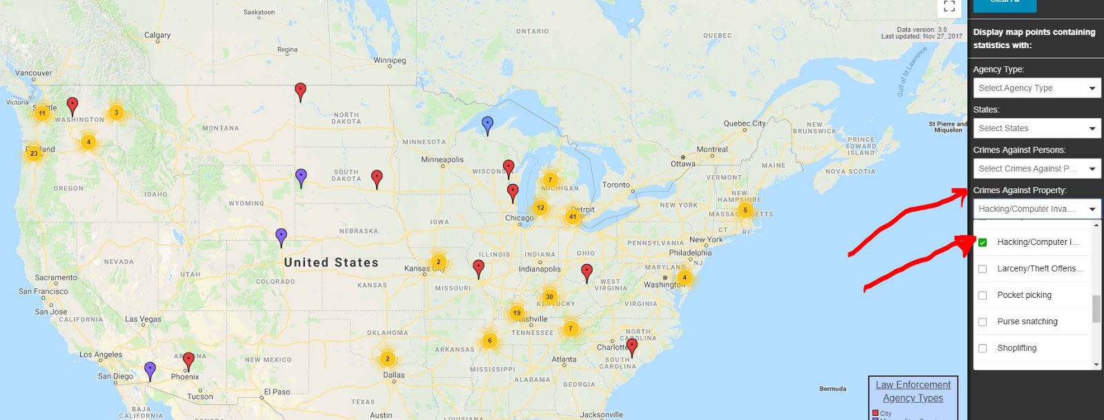 | Filtering the NIBRS 2016 map for “Hacking/Computer Intrusion” reports |