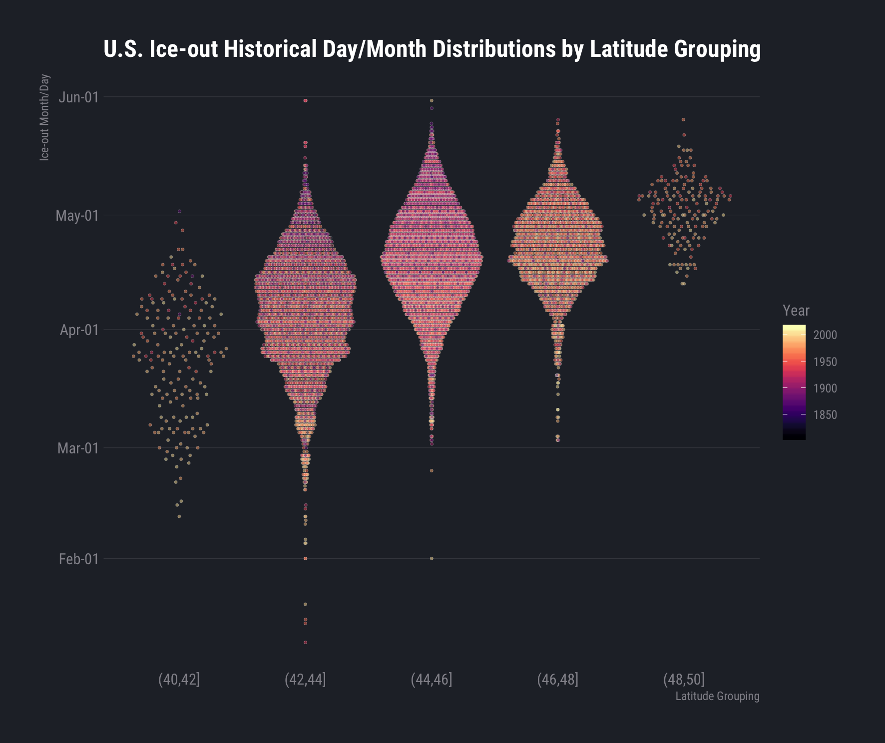 filter(nsidc_iceout, country == "United States", state == "ME") %>% mutate(iceout_date = as.Date(format(iceout_date, "2020-%m-%d"))) %>% # we want the Y axis formatted as month-day so we choose a leap year to ensure we get leap dates (if any) ggplot(aes(iceoff_year, iceout_date)) + geom_point(aes(color = lakename), size = 0.5, alpha=1/4) + geom_smooth(aes(color = lakename), se=FALSE, method = "loess", size=0.25) + scale_y_date(date_labels = "%b-%d") + labs( x = NULL, y = "Ice-out Month/Day", color = NULL, title = "Historical Ice-out Data/Trends for Maine Inland Bodies of Water" ) + theme_ft_rc(grid="XY")You can follow that code-pattern to look at other states. It’s also fun to look at the ice-out date distributions by latitude grouping:
