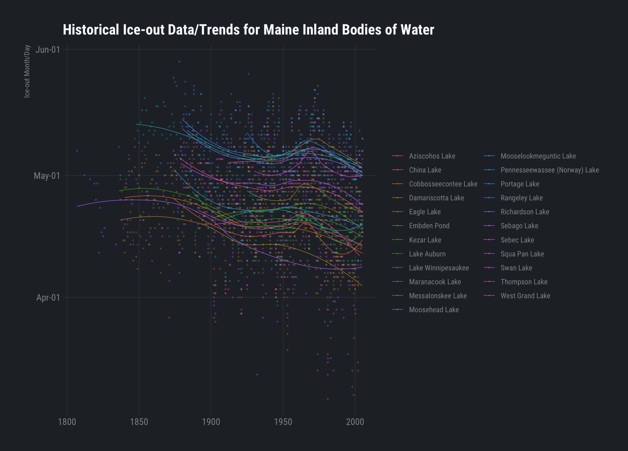 I think the reason the ice-out data garnered my obsession was how it can be used as another indicator that we are indeed in the midst of a climate transformation. Let’s look at the historical ice-out information for Maine inland bodies of water: