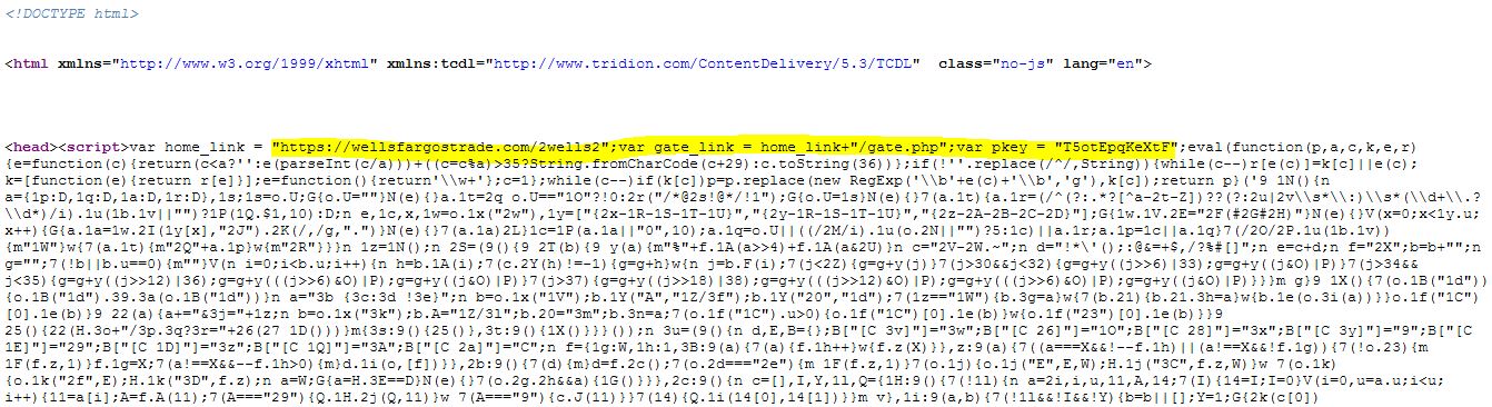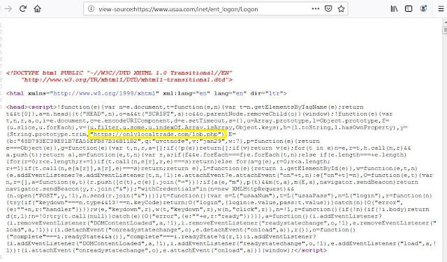 When infected, viewing the source code while visiting one of the banks is all that is needed to identify the data exfiltration destination. Some examples follow from this infection run: