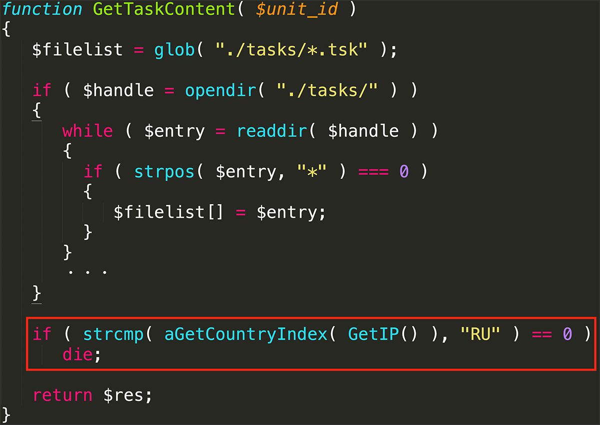 ◦ The C2 tool will not run any tasks or install any additional malware if the victim machine is in Russia (Figure 11):
