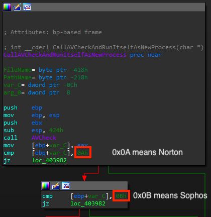 Figure 2: Amadey does not drop itself if it finds Norton or Sophos