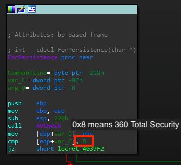 It also checks for installed antivirus products. If it finds 360TotalSecurity, as shown in Figure 4, it does not overwrite the registry key: