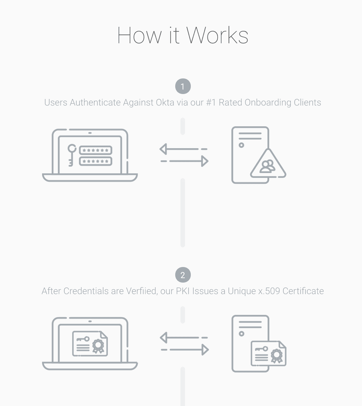 SecureW2 can provision devices with certificates easily through our #1 rated onboarding software. Paired with a variety of useful certificate management features available through our Cloud Managed PKI Service, employing Public Key Cryptography on your network has never been easier.. This guide will show you how to generate x.509 certificates with Okta, so you can take advantage of a maximum grade security network.