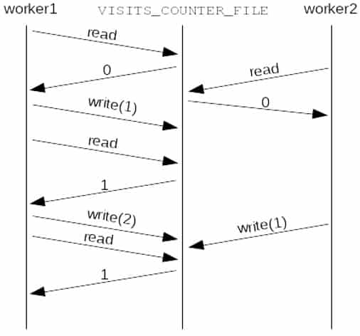 Both workers read the value 0 (zero) from VISITS_COUNTER_FILE. Then worker1 updates the value to 1. While worker2 is still processing its first request, worker1 receives a new request doing a read immediately followed by a write operation, updating VISITS_COUNTER_FILE to 2. When worker2 finishes handling the request, it writes to VISITS_COUNTER_FILE the value 1: the read value 0 (zero) incremented by one unit. Finally, worker1 receives a new request, reading the VISITS_COUNTER_FILE, whose value is 1.